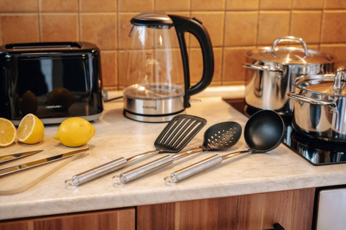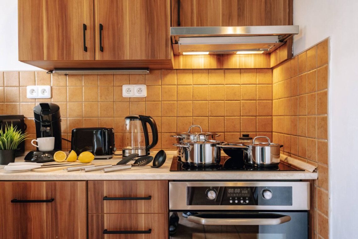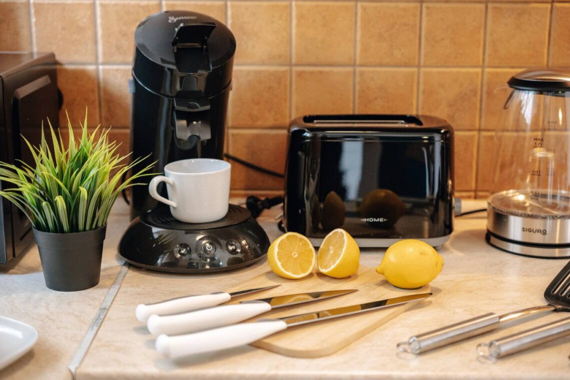 Fully equipped, separate kitchen with oven, hob, fridge, cookware, dishes, glasses, and a coffee machine with coffee